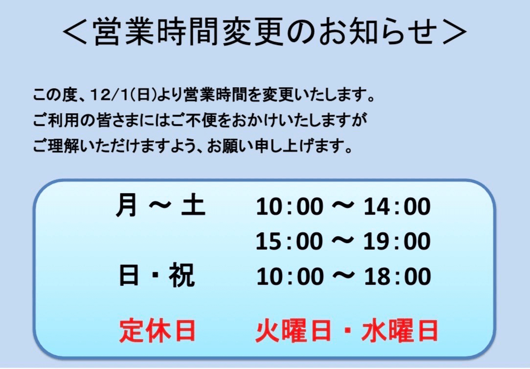 月~土曜日:10:00~14:00 15:00~19:00 日曜・祝日:10:00~18:00 |